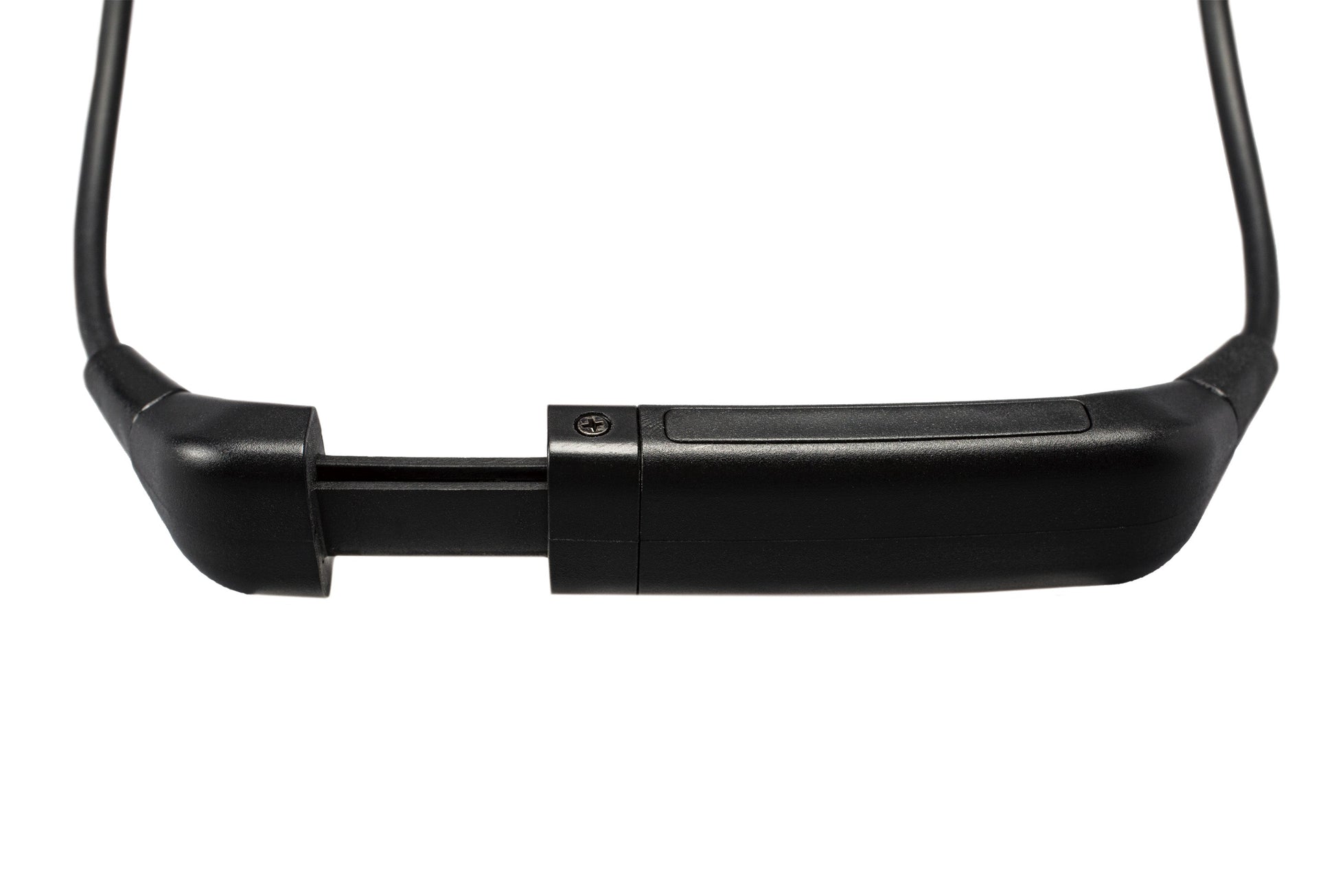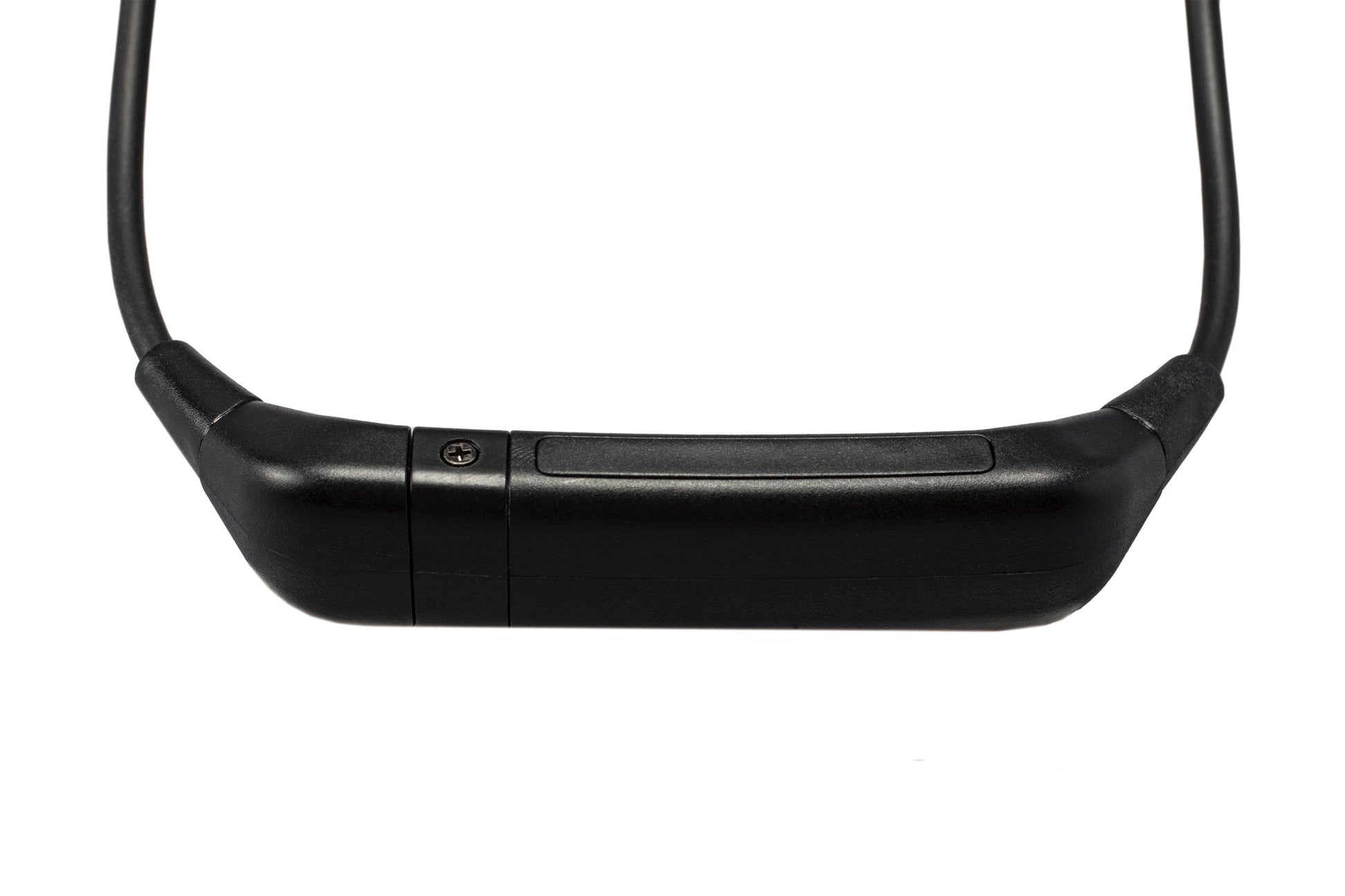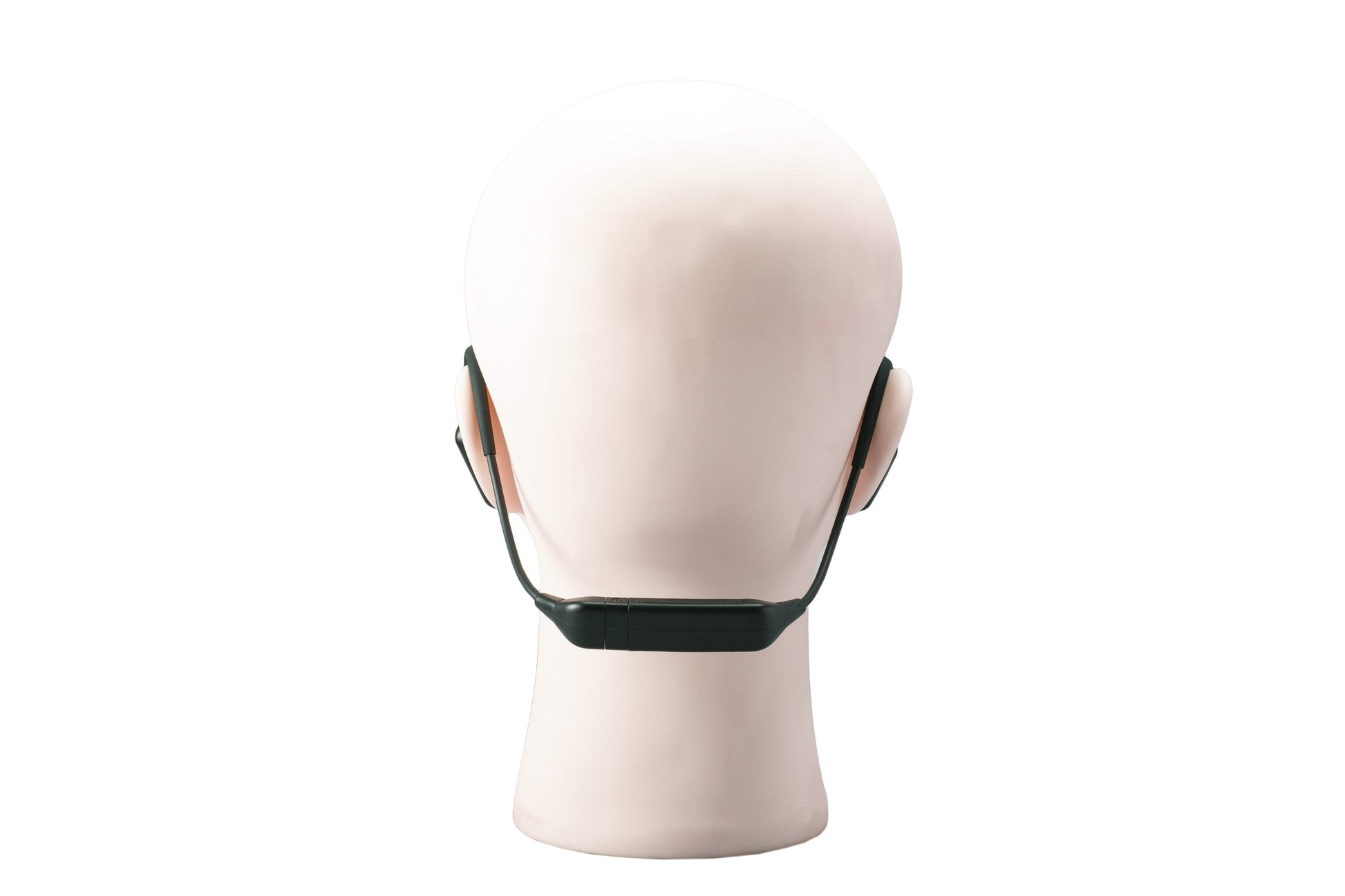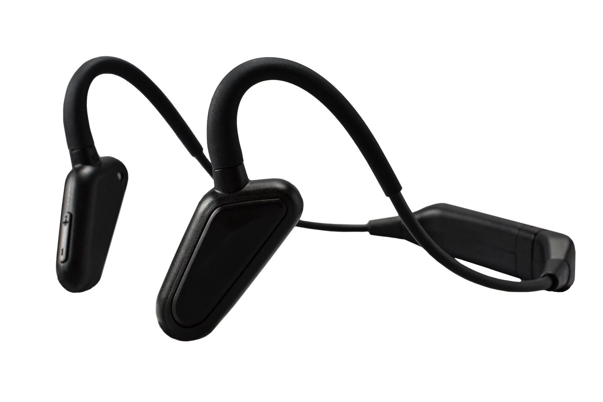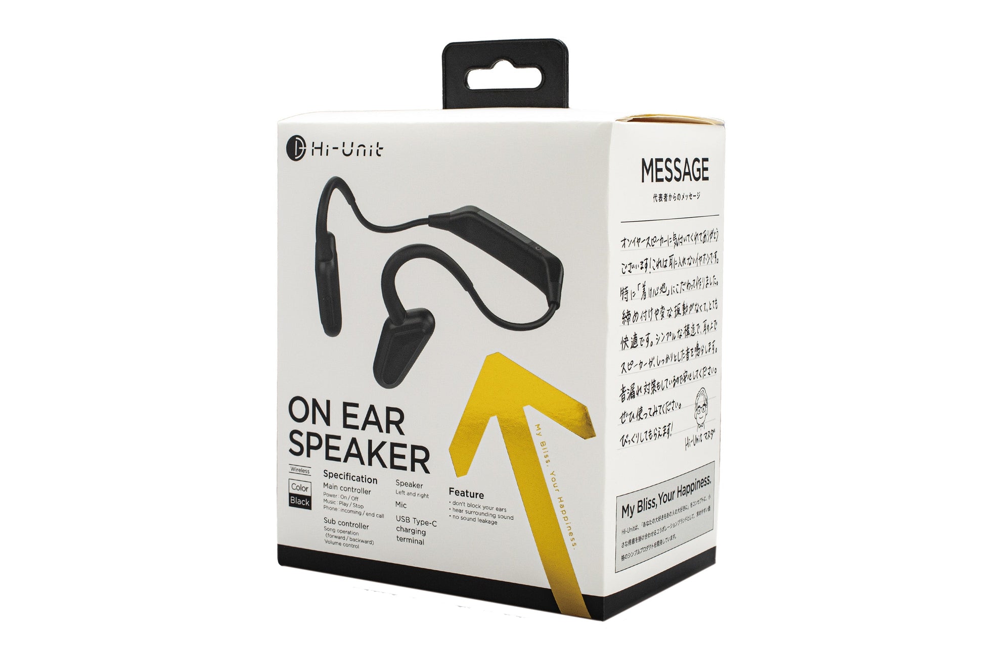 カナル型イヤホンのように耳に突っ込んで装着するでもなく、振動がある骨伝導でもなく、耳の上にスピーカーを配置する構造です。