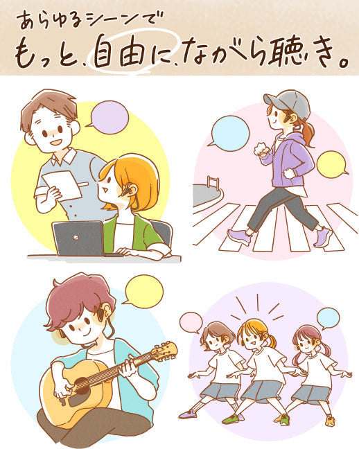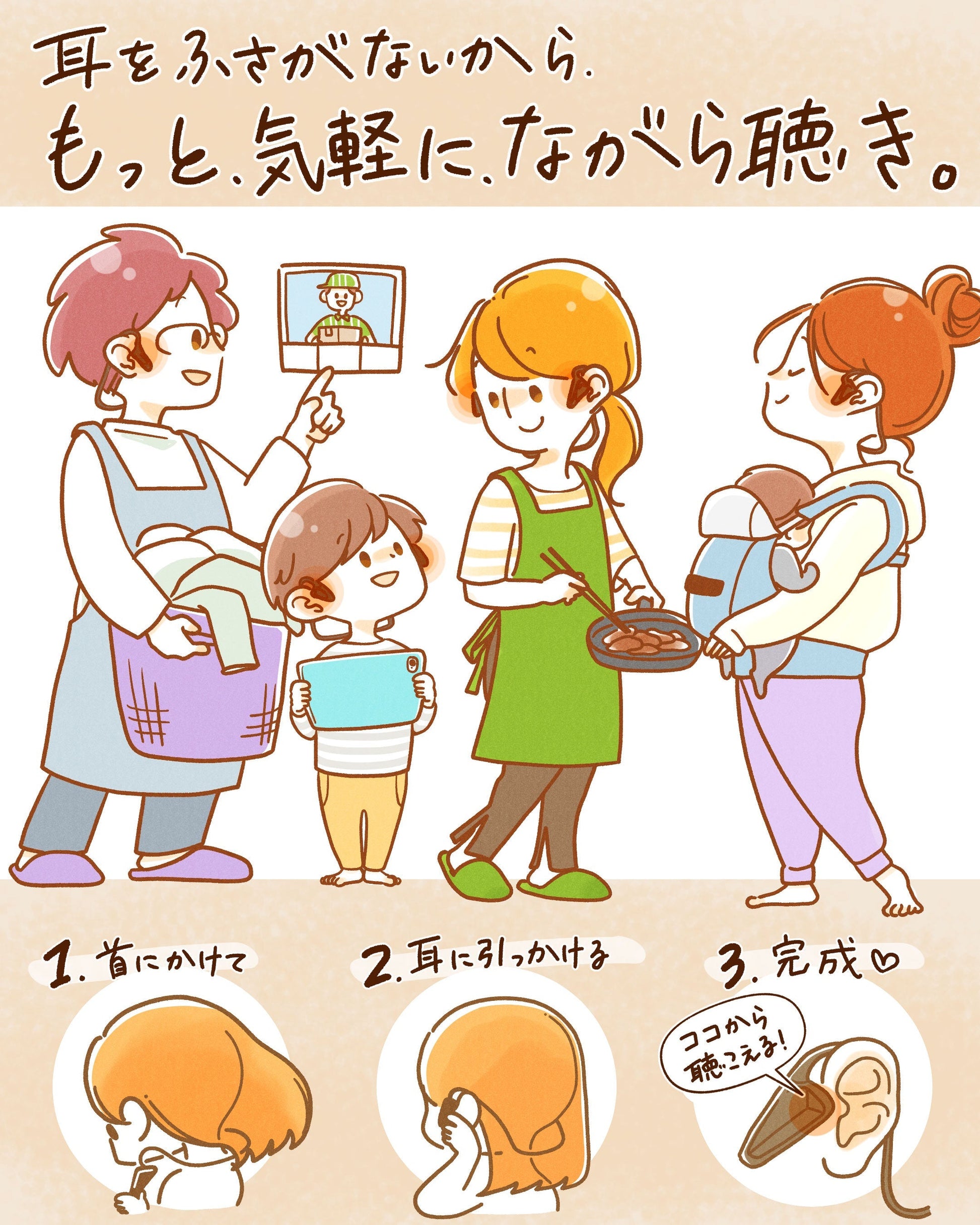日常、家事中、テレワーク中、お散歩中、育児中、スポーツ中、勉強中、お子さまが耳を塞ぐイヤホンをしてしまうのが心配な親御さん、お子さまから大人まで、あらゆるシーンで着けながら過ごせるイヤホン!